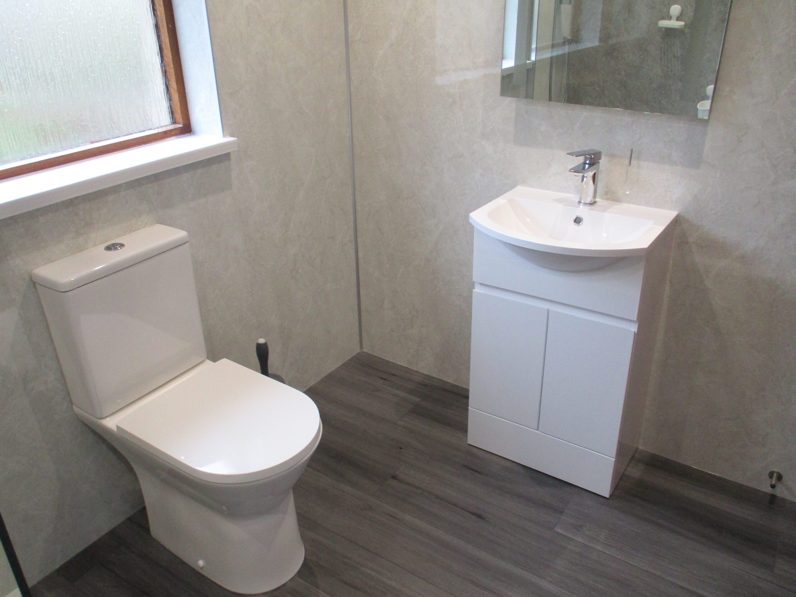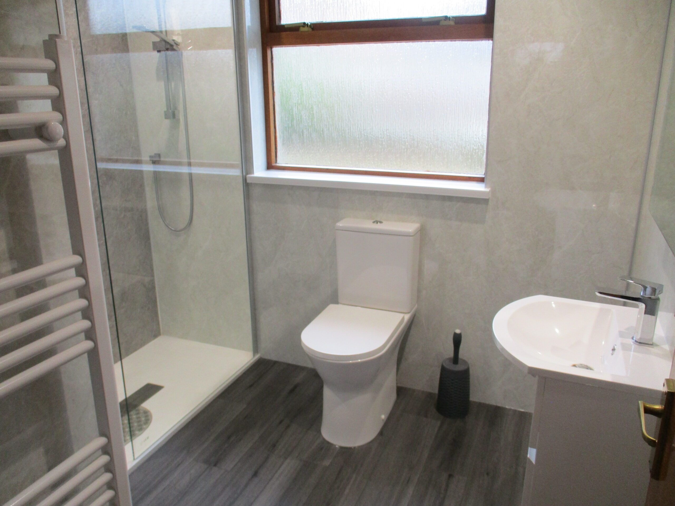 Pristine shower room comprising white wash-hand basin with chrome miser tap and white gloss storage unit underneath. W.C. Double shower cubicle with composite panelling and glazed shower enclosure. PVC ceiling with LED ceiling light. Display mirror. Extractor fan. Obscured double glazed window to the rear elevation. Vinyl flooring. Large heated white towel rail.