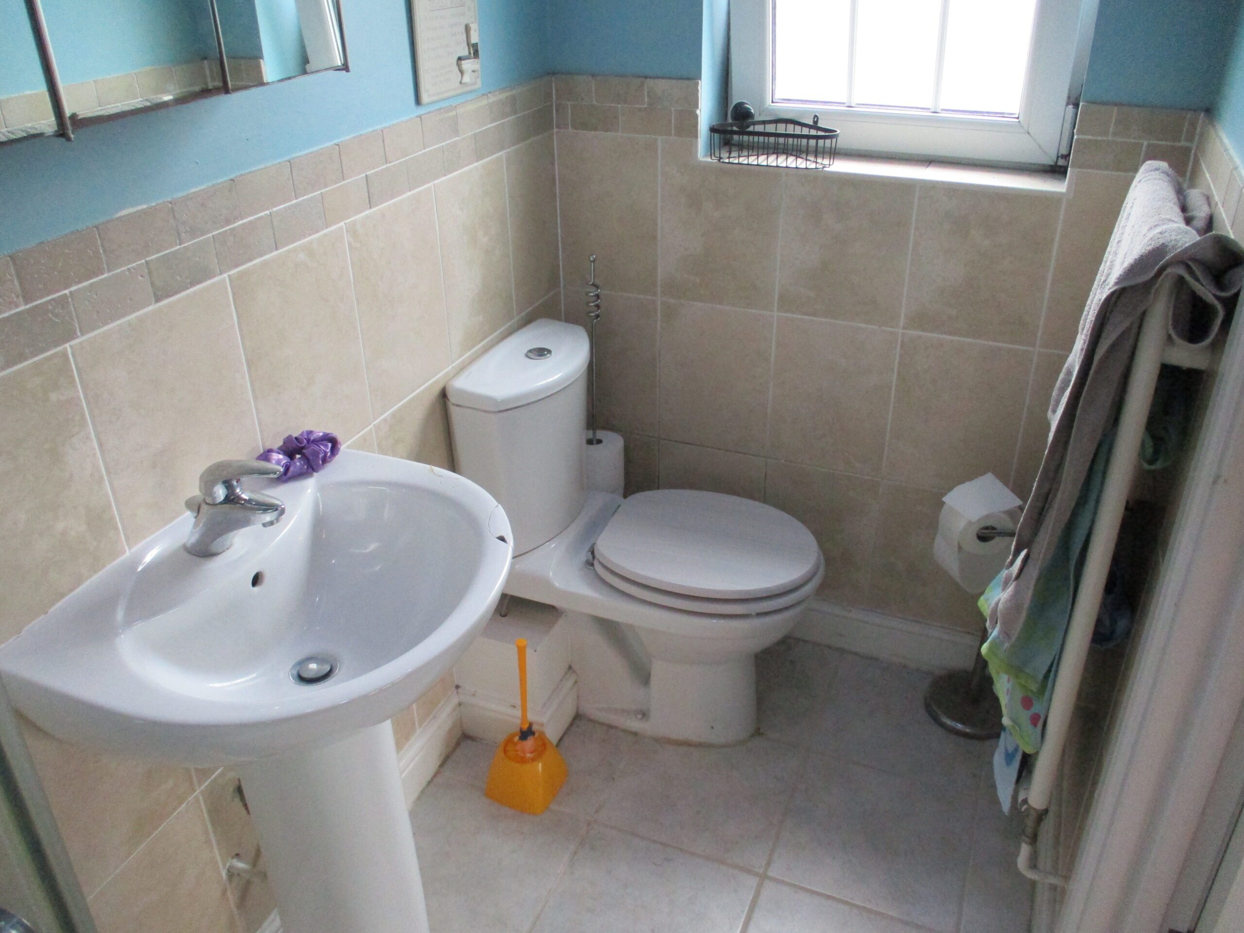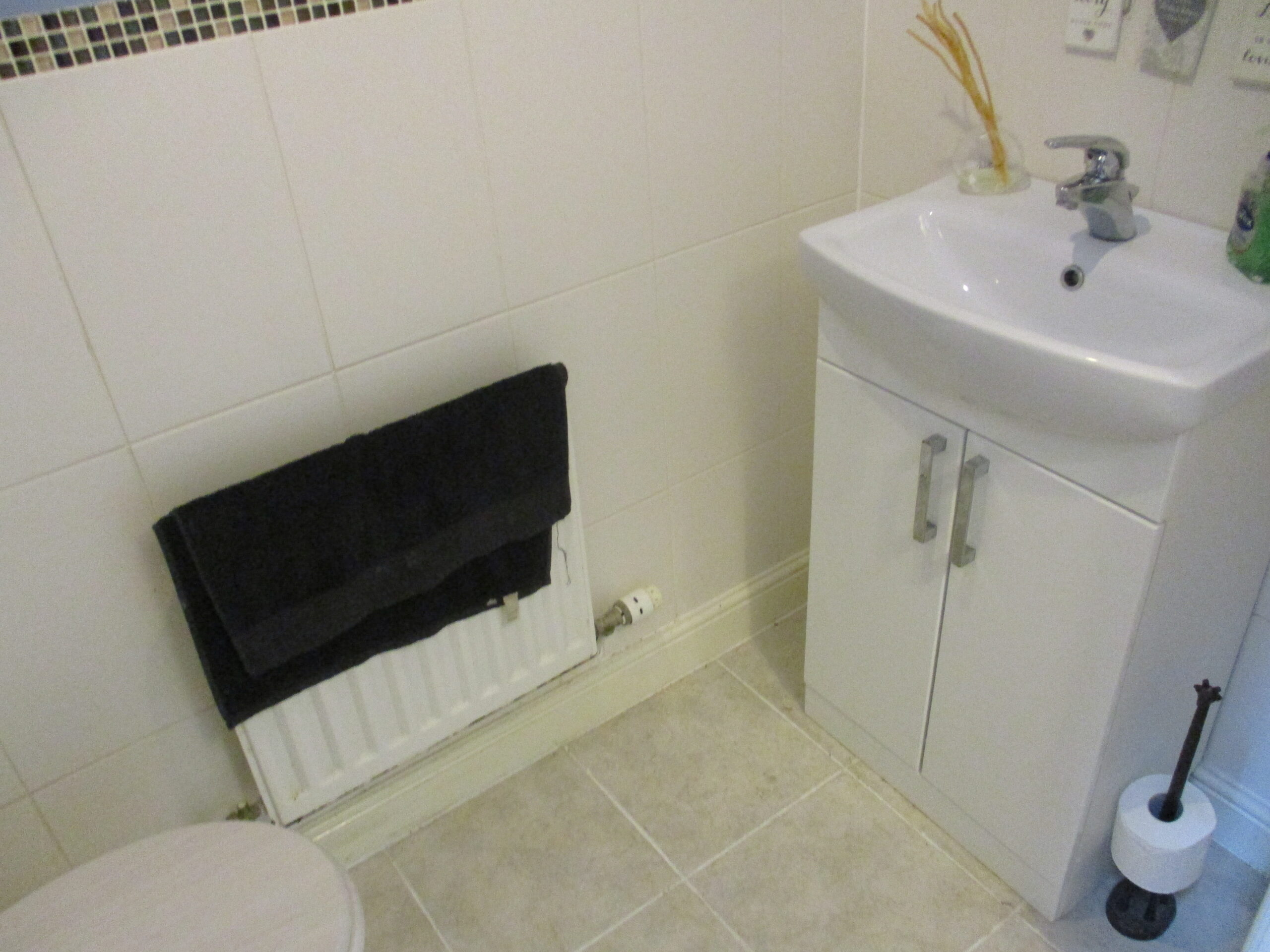 Modern white wash-hand basin with chrome mixer taps and storage unit underneath. W.C. Extractor fan. Tiled walls. Tiled floor. Radiator with thermostatic valve.