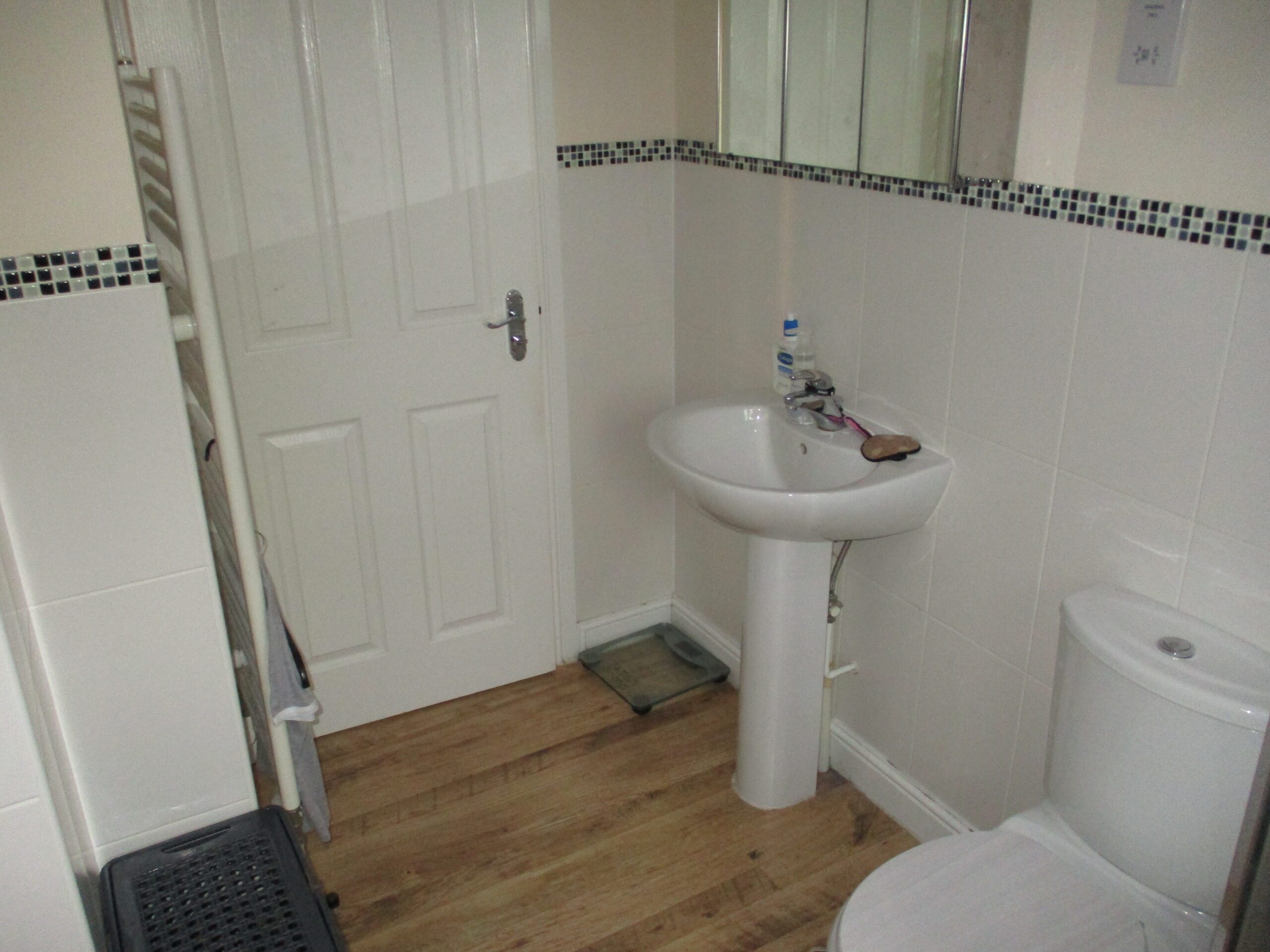 Obscured double glazed window to the rear elevation. White wash-hand basin with chrome mixer tap and W.C. Tiled shower cubicle with Mira shower. Partially tiled walls. Shaver point. Laminate flooring. Heated towel rail.