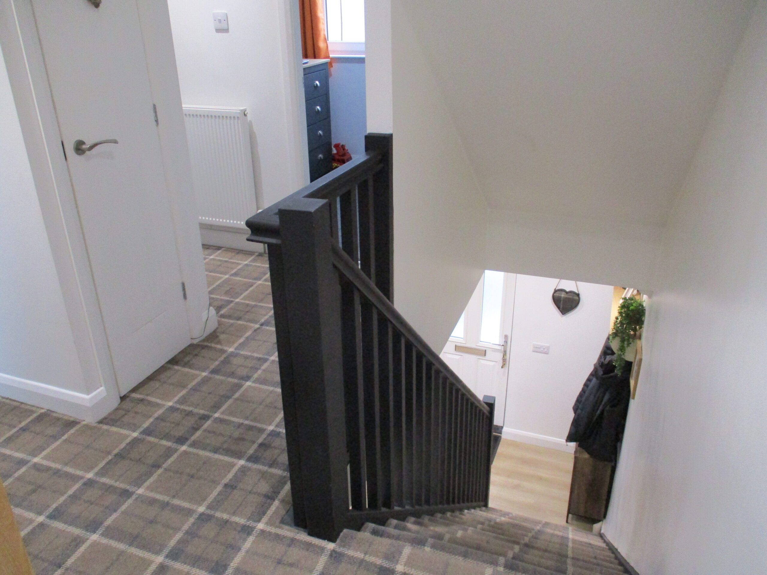 Matt black painted balustrades.  Hatch with wooden folding ladder attached to insulated and boarded attic.  Three inset ceiling spotlights.  Smoke alarm.  Coat hooks.  Useful built-in linen cupboard (0.55m x 0.55m).  Fitted carpet.  Radiator with thermostatic valve.  Modern white panelled doors off to three bedrooms and bathroom.