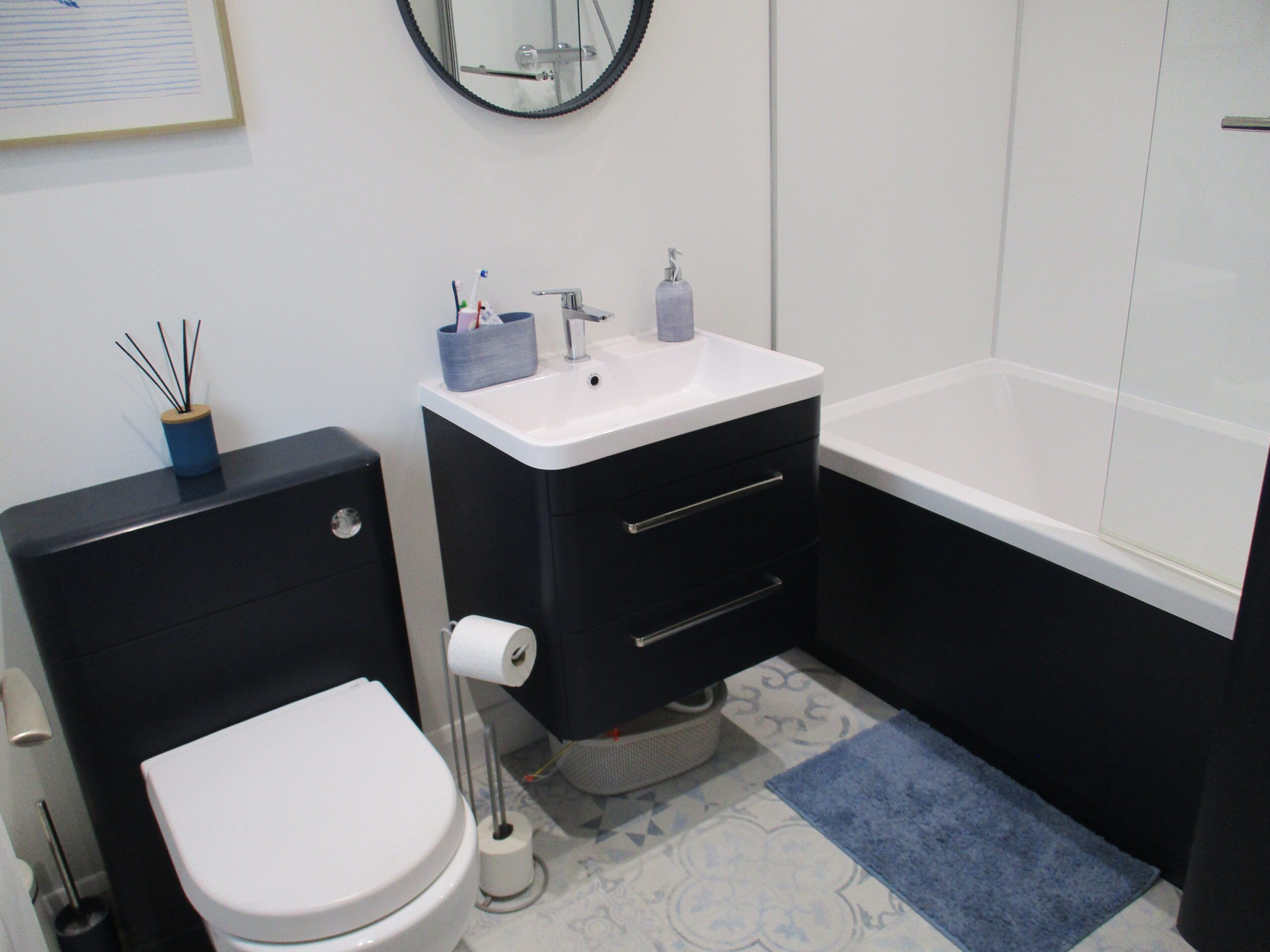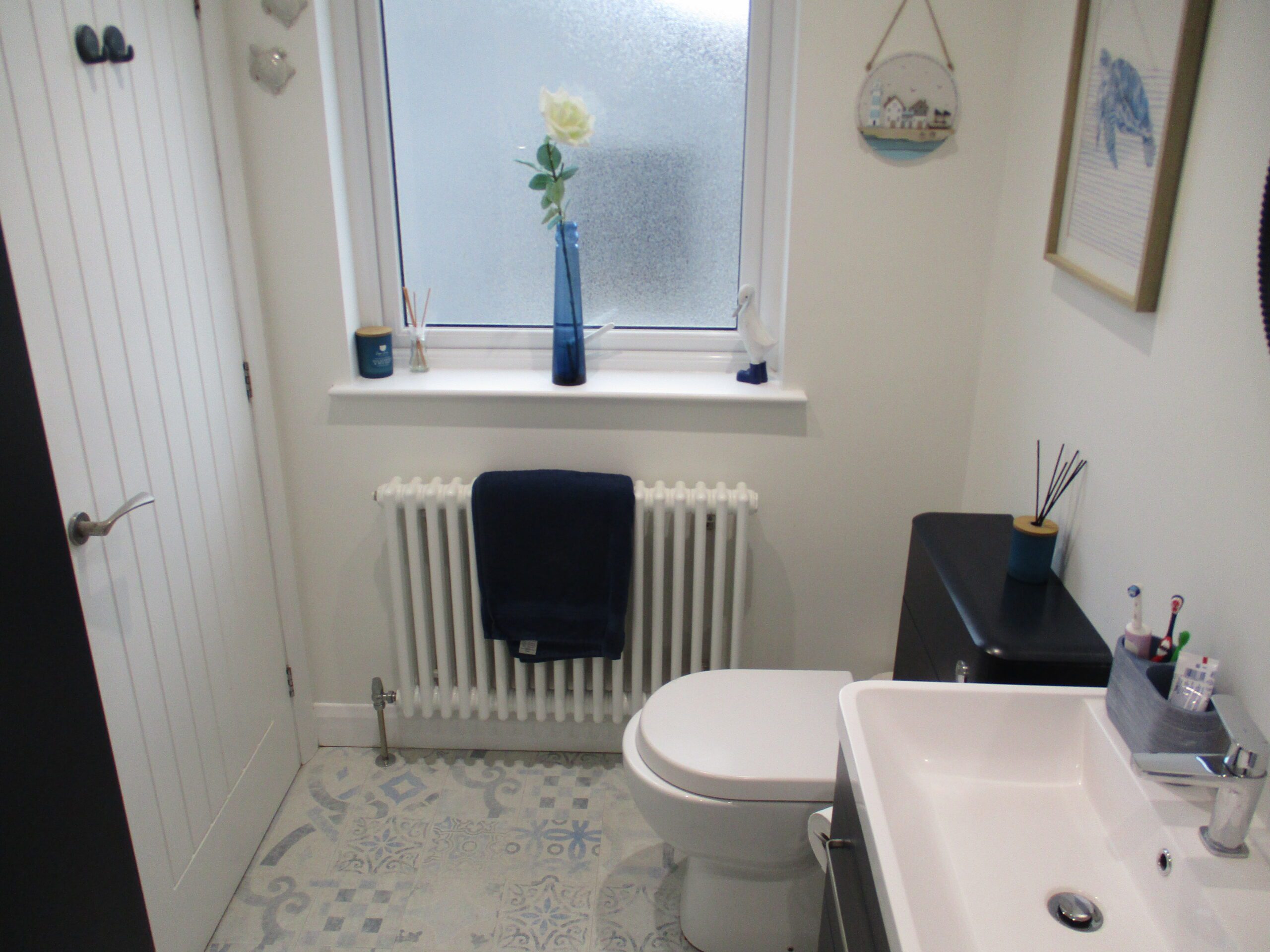 Very modern and up to date pristine bathroom comprising of a white wash-hand basin with chrome mixer taps and soft close drawer units underneath.  Bath with Mira shower.  Shower screen attached.   Dual flush W.C. Four inset ceiling spotlights. Extractor fan.  Obscured double glazed window to the side elevation.  Vinyl mosaic tiled effect flooring.   White column radiator with thermostatic valve.