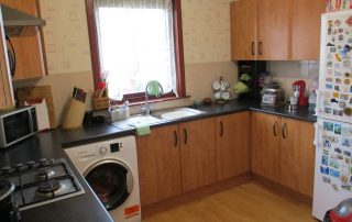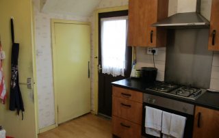 Enter through a part-glazed timber door. Modern range of wall and base units with tile splashback incorporating a single drainer unit with swan necked chrome mixer taps. A Four ring gas hob and built-in oven with chrome splashback and chrome cooker head extractor above. Plumbed for washing machine (invertermotor hotpoint washing machine & small whiteknight dryer included in sale) Ceiling striplight. Smoke alarm. Space for fridge/freezer. Radiator. Double-glazed window to rear elevation. Under the stair storage cupboard with light fitting.