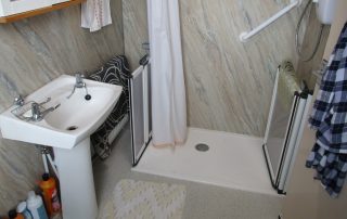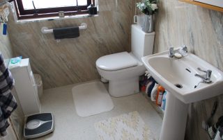 Respatex waterproof wall panelling comprising Mira sprint electric shower (2024 installed) with shower rail curtain. PVC ceiling with LED lights. Whitewash-hand basin and dual flush W.C. Vinyl non-slip flooring. Radiator. Extractor fan. Mirrored bathroom unit. Obscured double-glazed window to side elevation.