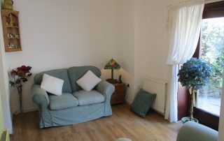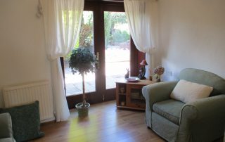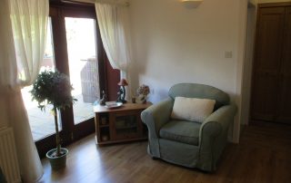 Double glazed French doors leading out to a paved patio area and rear garden. Two wall lights. Television aerial point. Wood floor. Two radiators. Door through to inner walkway giving access to shower room.