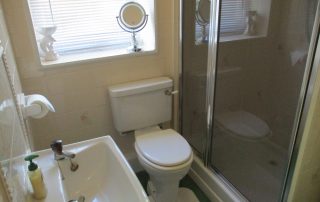 Wash-hand basin and W.C. Double fully tiled shower cubicle with Redring shower. Fully tiled walls. Tiled sill. Obscured double glazed window to the rear elevation. Venetian blinds. Wall mounted display mirror. Towel rail.