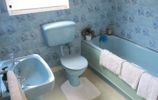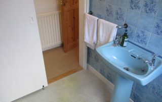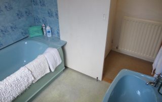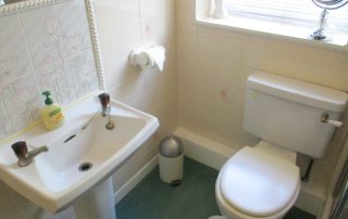 Comprising of coloured wash-hand basin, bath and W.C. Fully tiled walls. Tiled display sill. Obscured single glazed window to the rear elevation. Venetian blinds. Newly laid non slip vinyl flooring. Wall mounted electric heater.