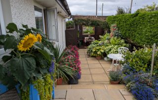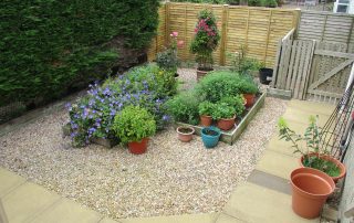 Enclosed rear garden is mostly laid out in paving and chipping stones. Low level wooden gates to either side.