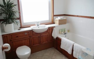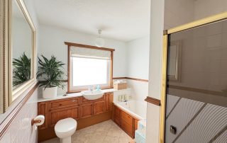 White wash-hand basin and bath with chrome mixer taps. W.C. Tiled shower cubicle with Mira electric shower. Built-in low level storage units along one wall. Dado rail. Extractor fan. Obscured double glazed window to the side elevation. Roman blind. Shaver point. Lightshade. Ceiling spotlight. Vinyl flooring. Radiator with thermostatic valve.