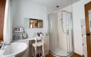 White wash-hand basin with chrome mixer taps and W.C. Corner shower cubicle with Mira shower. White coloured storage units and vanity unit. Illuminated sensor display mirror. PVC ceiling with five inset ceiling spotlights. Obscured double glazed window to the front elevation. Tiled splashbacks. Vinyl flooring. Large white towel radiator.