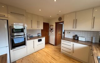 Plentiful cream coloured high gloss wall and base units incorporating a double sink unit with single drainer and chrome swan neck mixer taps. Complimentary work surface areas. 4-Ring gas hob, integrated cooker hood extractor, multi-function oven and fan-assisted oven with slide and hide door. Integrated dishwasher. Space for fridge-freezer. Tiled splashbacks. Nine Inset ceiling spotlights. Beechwood floor. Radiator with thermostatic valve. Timber framed door through to the entrance hallway and further door through to the utility room.
