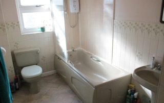 Three piece coloured suite comprising bath, wash-hand basin and W.C. Triton T80 shower over the bath with shower screen attached. Extractor fan. Partially tiled walls. Obscured double glazed window to the side elevation. Inset display shelving. Extractor fan. Vinyl flooring. Radiator.