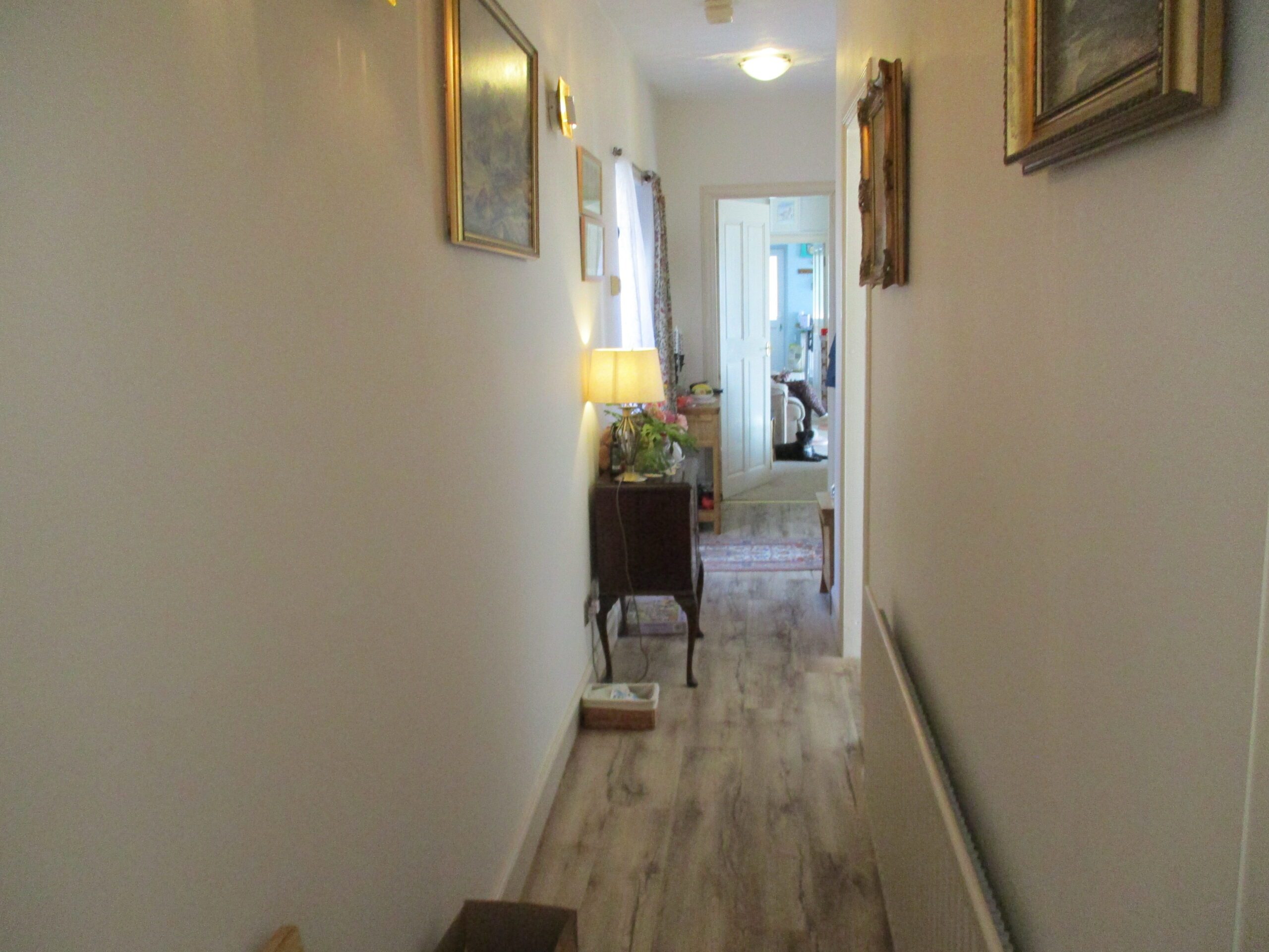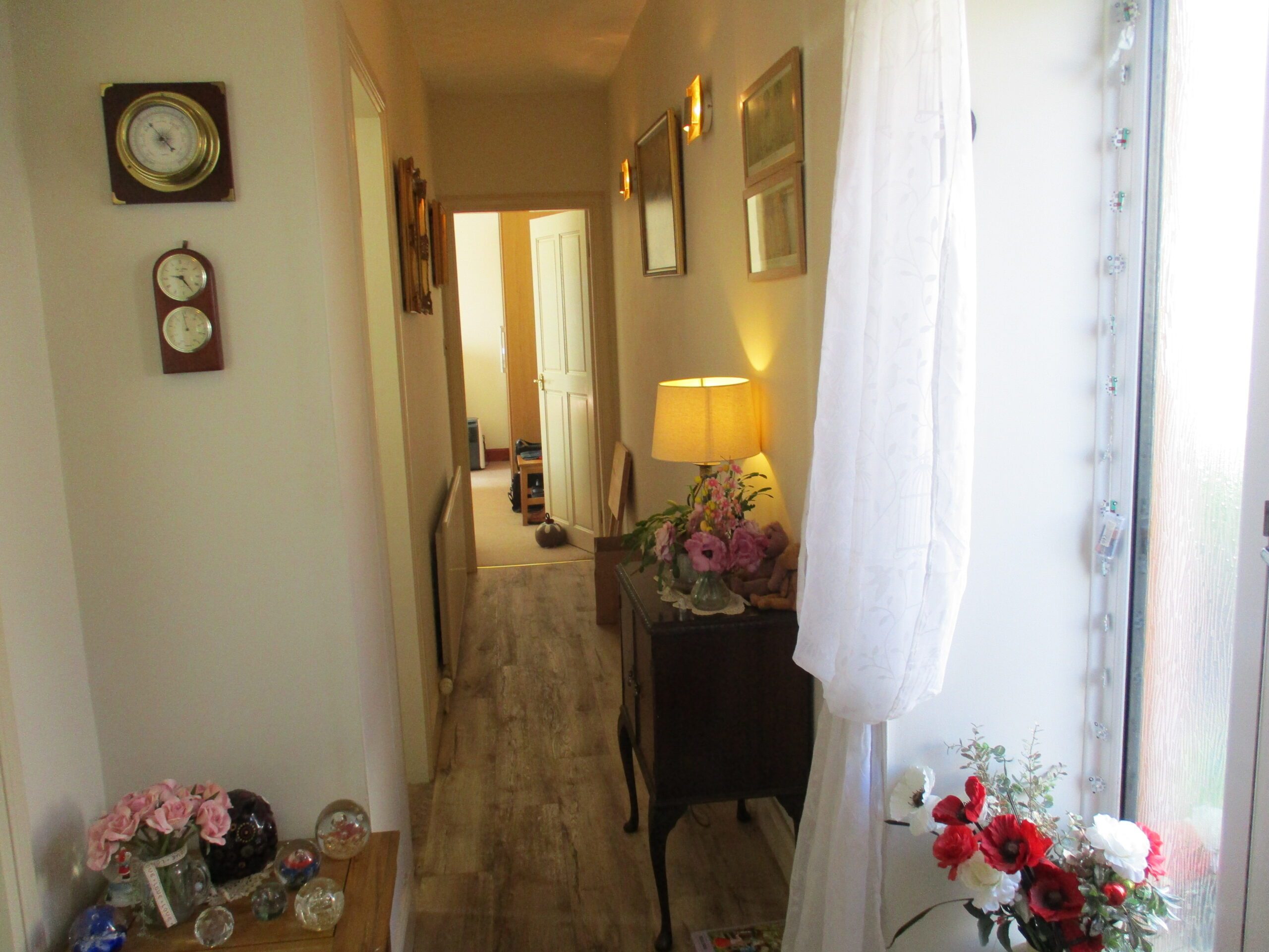 Entered through a part double glazed composite door with obscured side panel. Smoke alarm. Two wall lights and two central light fittings. Central heating thermostat. Two radiators with thermostatic valves. Vinyl laminate effect flooring. Doors off to a spacious bright lounge, two good sized bedrooms and a large bathroom.