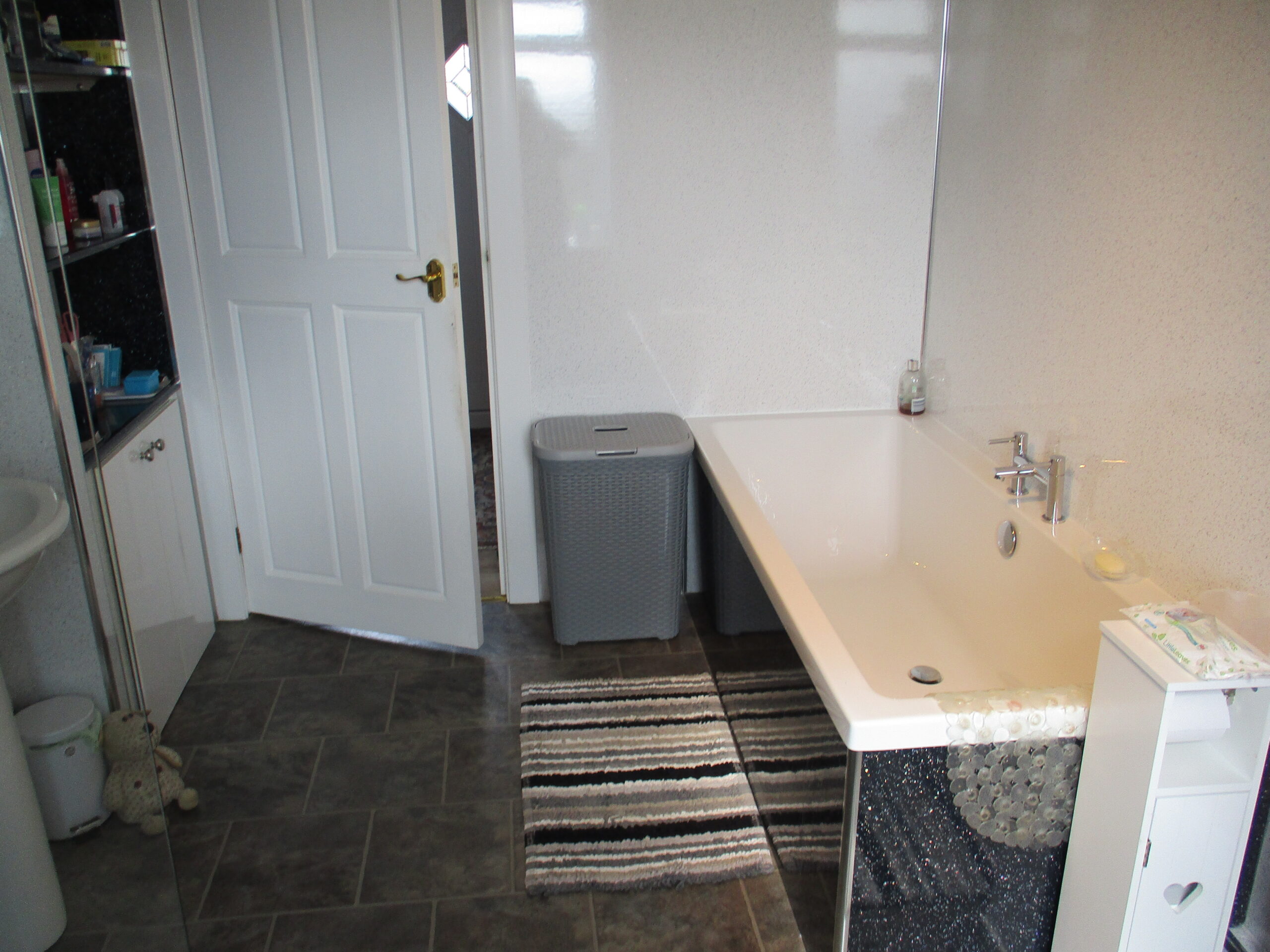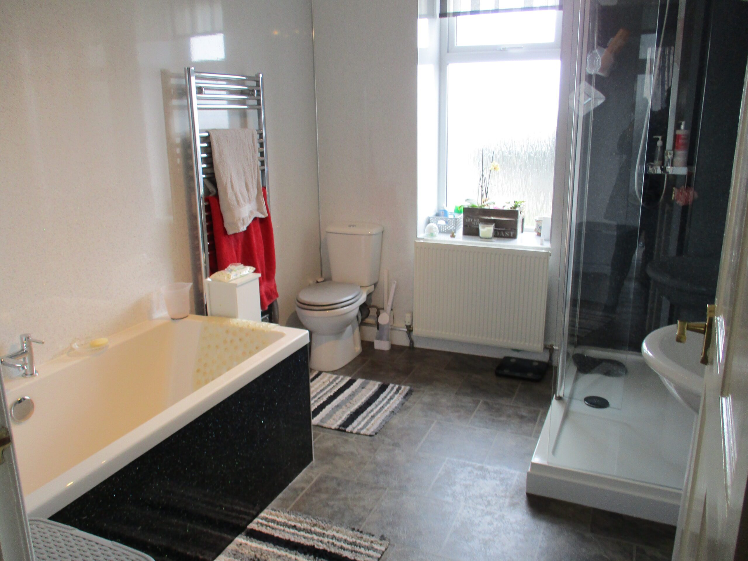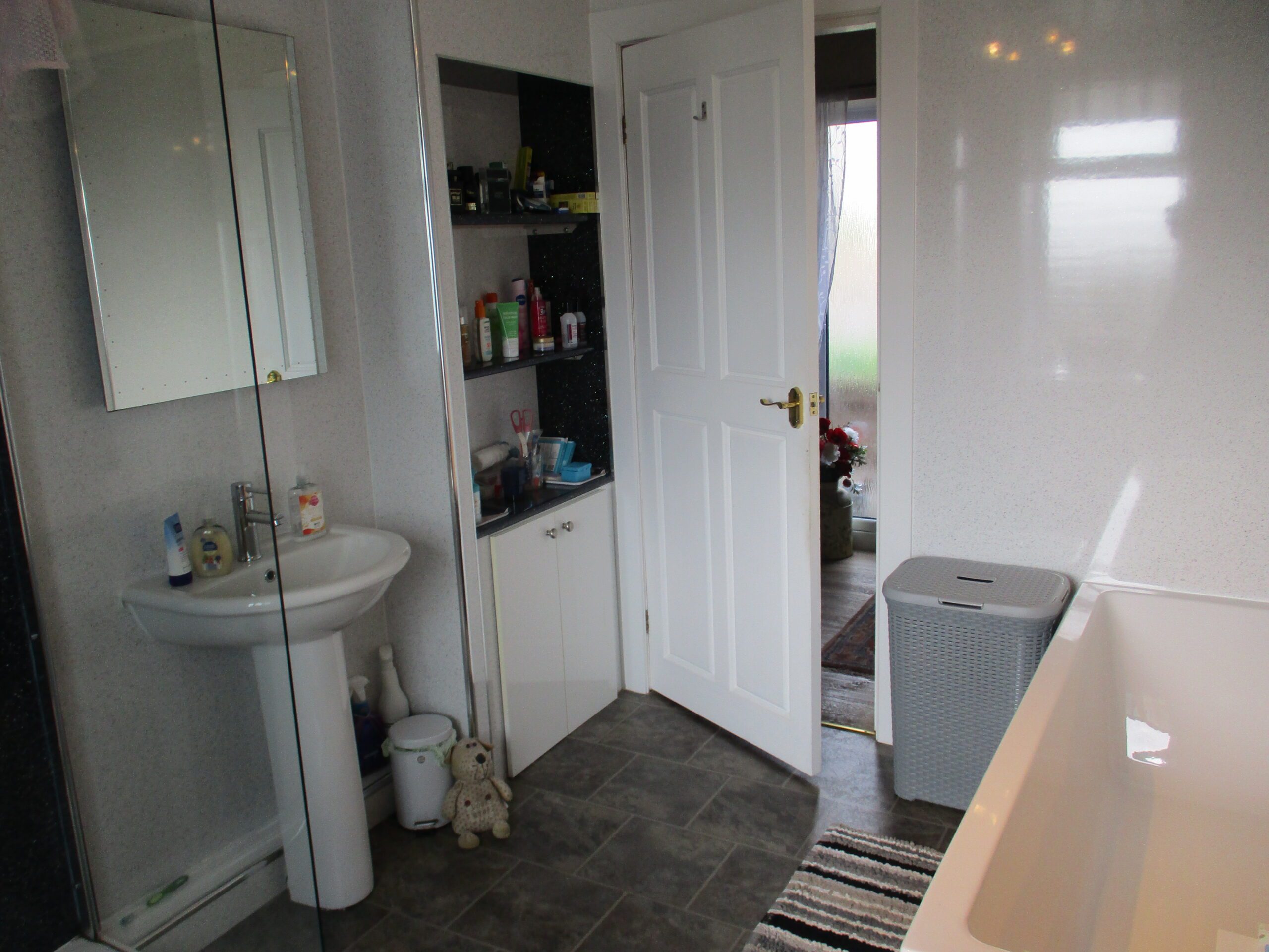 White three piece suite comprising wash-hand basin with chrome single mixer tap, large bath with chrome mixer taps and dual flush W.C. Large walk-in shower enclosure with dual rainfall shower. Built-in low level storage compartment with shelving above. Wall mounted illuminated sensor display mirror with shaver point. Waterproof wall boarding. PVC ceiling. 4-Chrome ceiling light fitting. Extractor fan. Obscured double glazed window to the rear elevation. Roller blind. Vinyl flooring. Large heated chrome towel rail.