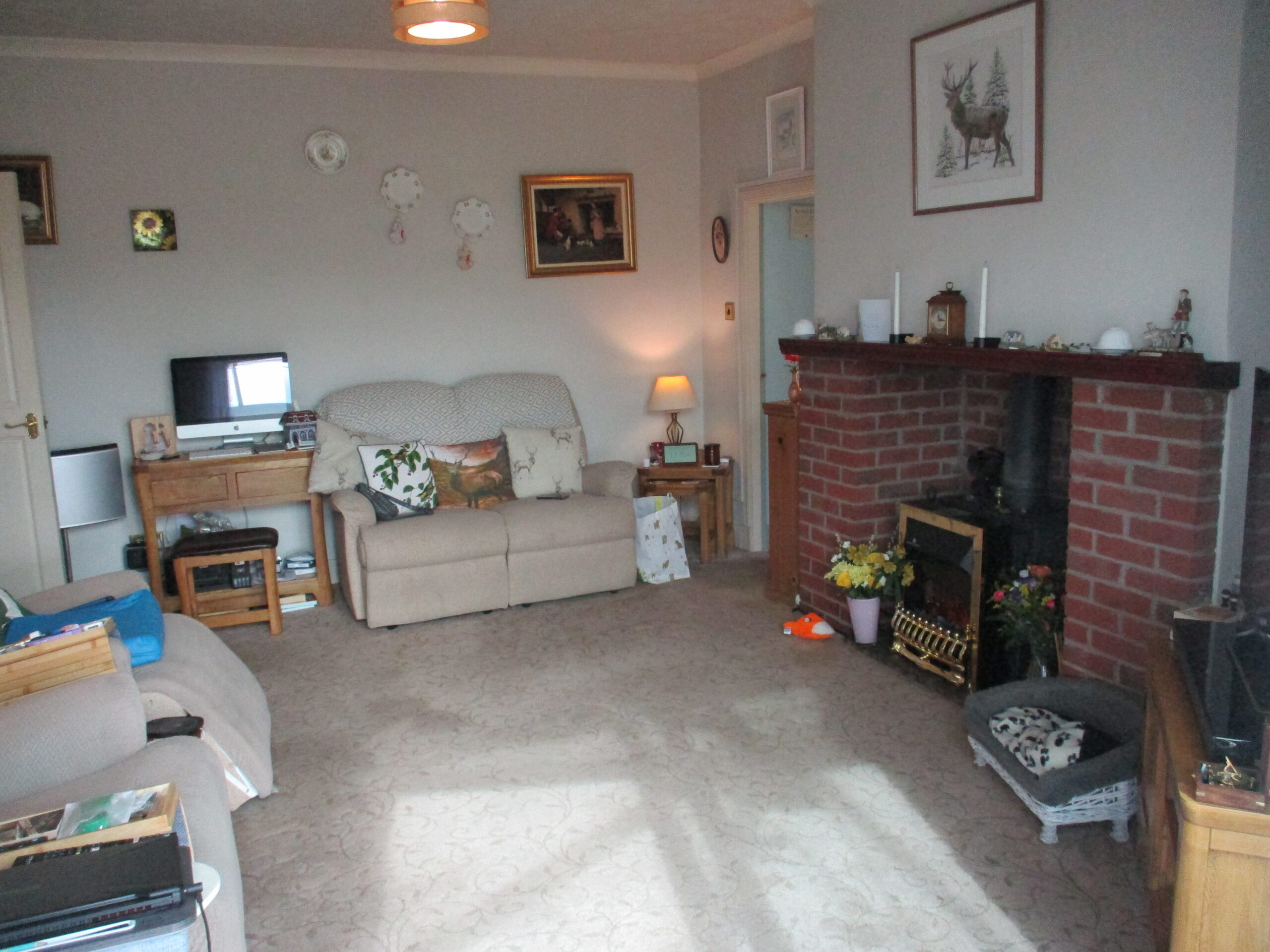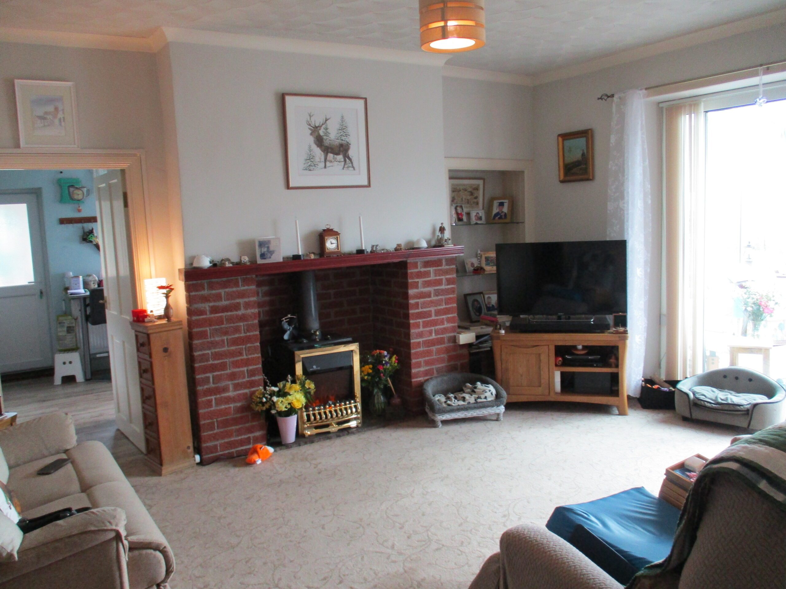 Lovely welcoming room with solid fuel stove set within a brick surround. Television point. Telephone point. Coving. Smoke alarm. Fitted carpet. Radiator with thermostatic valve. U.P.V.C double glazed doors through to the conservatory. Door through to fitted kitchen.