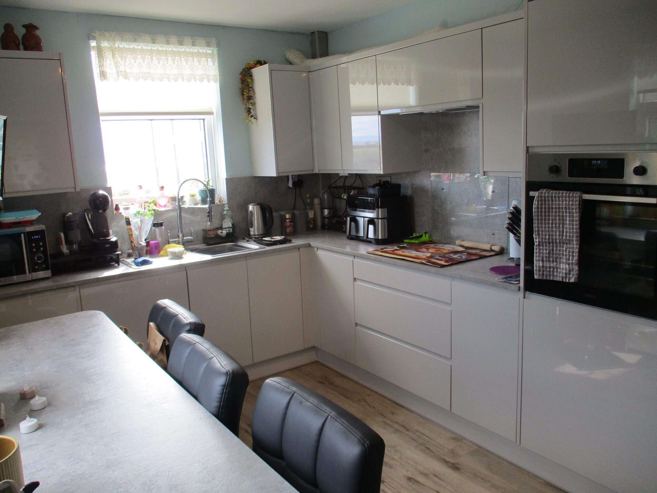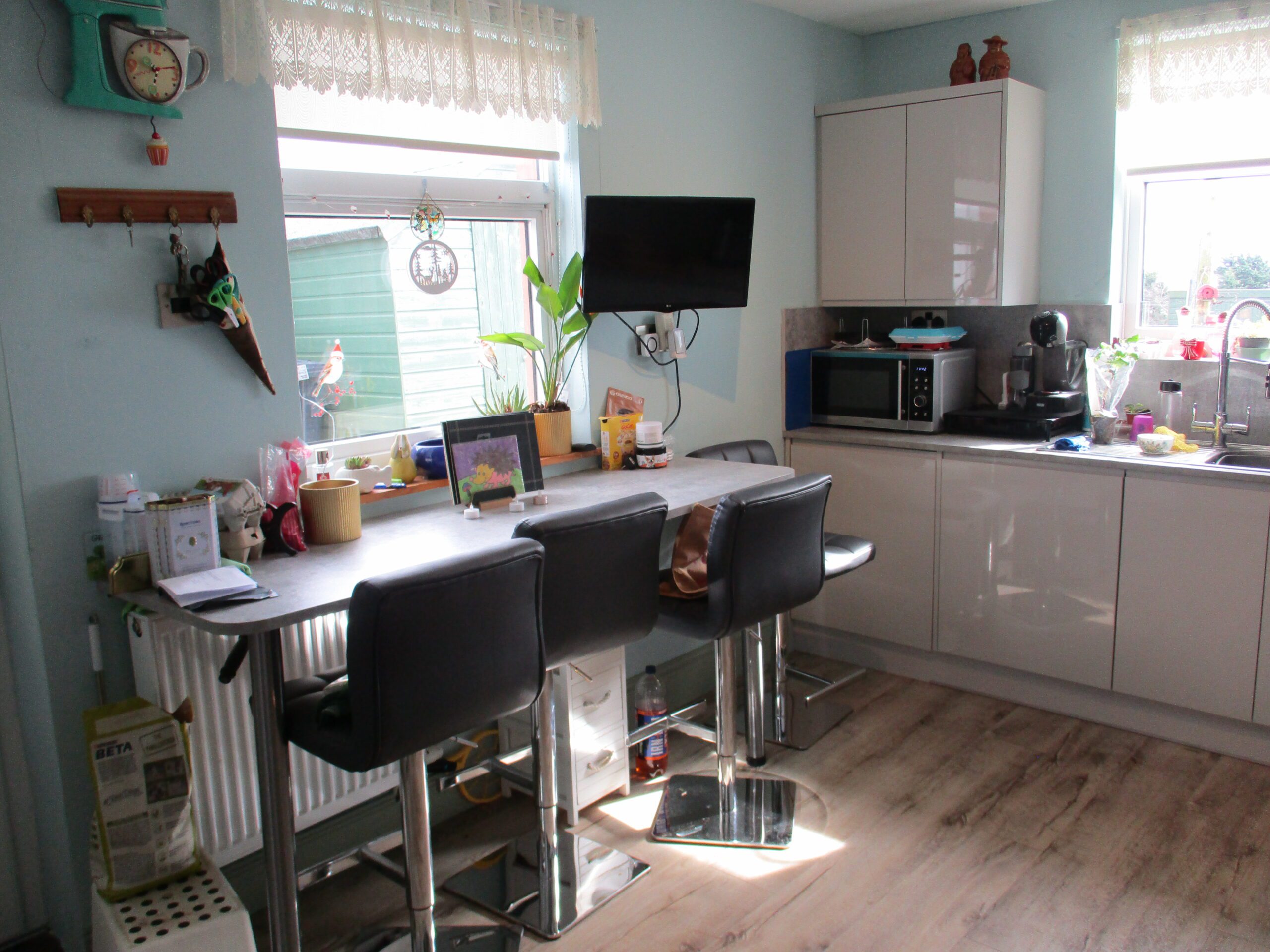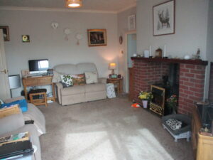 Stylish and plentiful wall and base units installed approximately two years ago. Complimentary worksurface areas and breakfast bar area. Single drainer sink unit with chrome swan neck pull out mixer spray tap. One of the units conceals the Worcester’ condensing-combi boiler. Built-in fan-oven, hob and integrated cooker hood extractor with lights. Triple spotlight ceiling fitting. Plumbed for washing machine and dishwasher. Space for fridge/freezer. The electric meters and consumer unit are concealed in the kitchen wall cupboard. The solar panels on the roof are understood to be owned outright and are connected to the mains electricity grid. Double glazed windows to the side, front and rear elevations. Roller blinds. Vinyl flooring. Radiator with thermostatic valve. Glazed U.P.V.C door through to the rear vestibule.